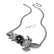 Neobvyklý černý náhrdelník s kolibříkem a květinou.
