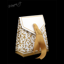 Elegantní krabička s ornamenty zlaté barvy a stuhou.