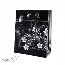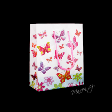 Lesklá papírová taštička s veselým potiskem barevnými motýlky.