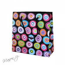 Dárková taštička z matného papíru s výraznými barevnými kolečky.