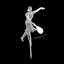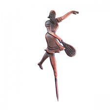 Drobná retro brož ve tvaru tenistky s raketou.
