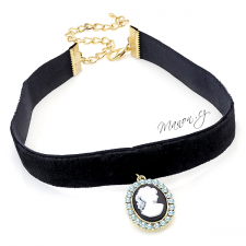 Sametový obojkový náhrdelník na krk s hlavou ženy a kamínky.