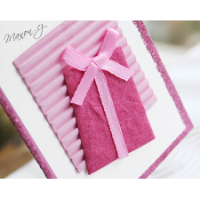 Drobné, ručně zdobené papírové přáníčko růžové s ozdobou ve tvaru dárečku. Bez textu (uvnitř prázdné).