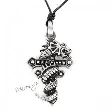 Cínový přívěsek ve tvaru draka na kříži s textilním černým řemínkem.
