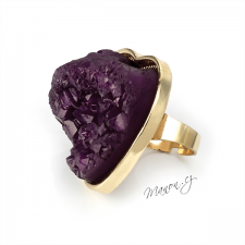 Prsten ve tvaru nepravidelného srdce s umělým fialovým kamenem.