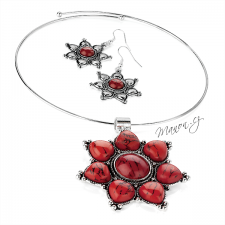 Výrazný náhrdelník obruč a náušnice s květy a barevnými kameny.